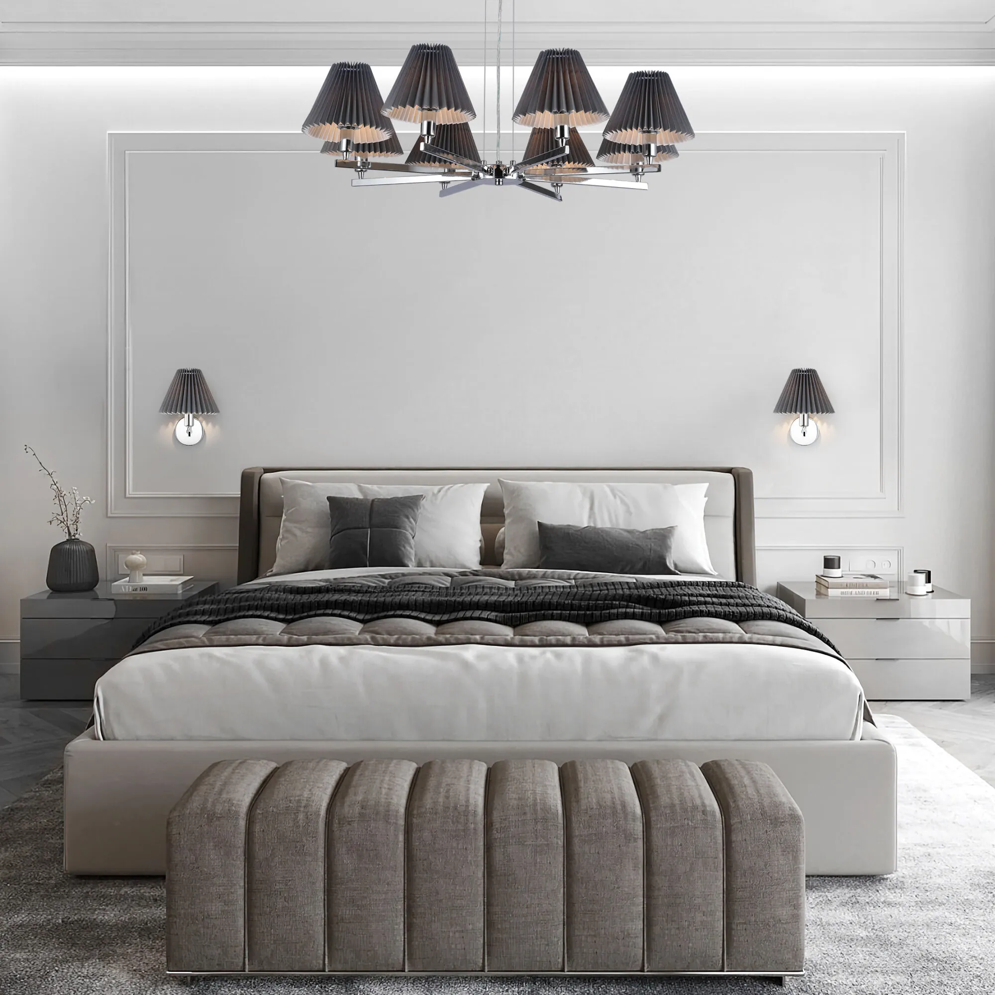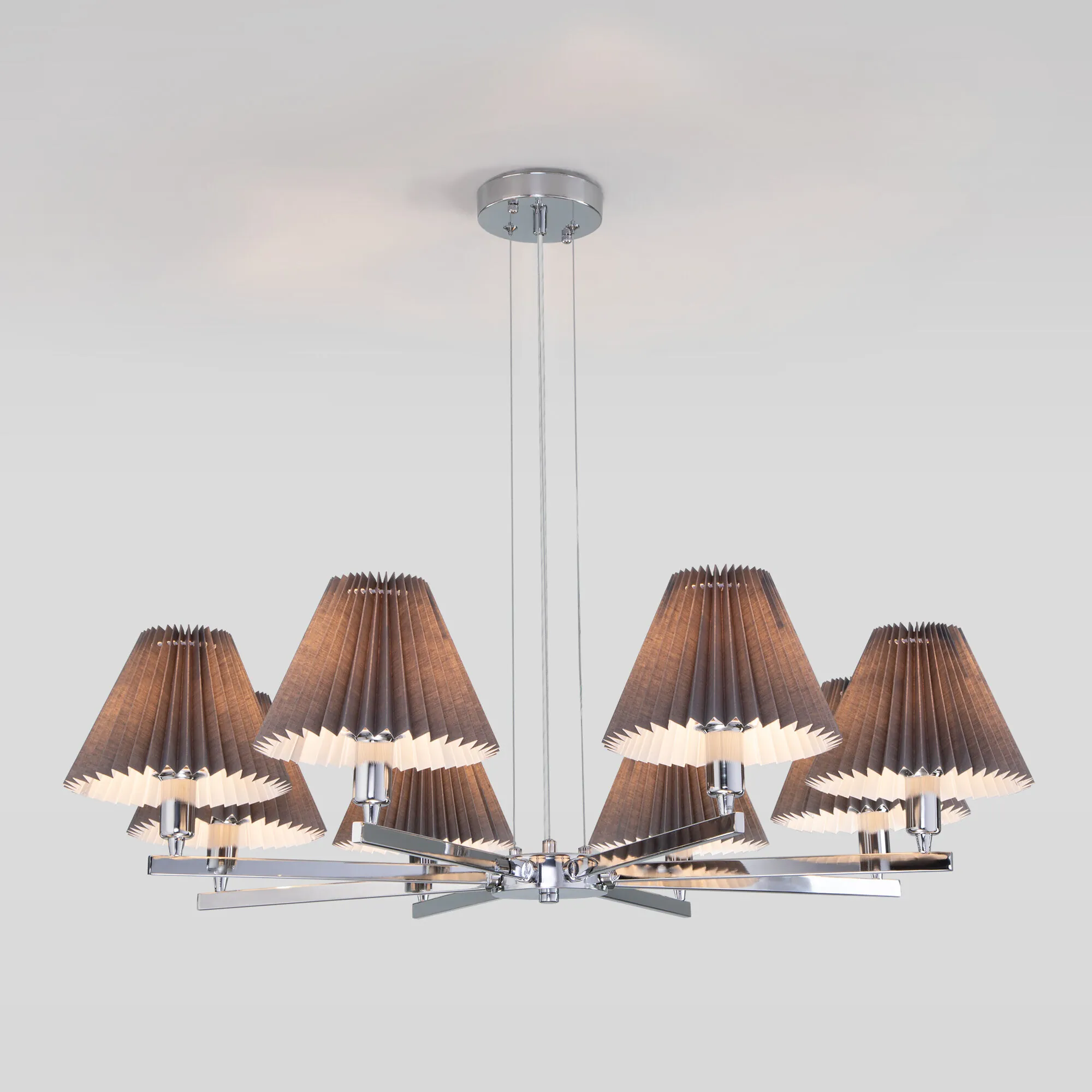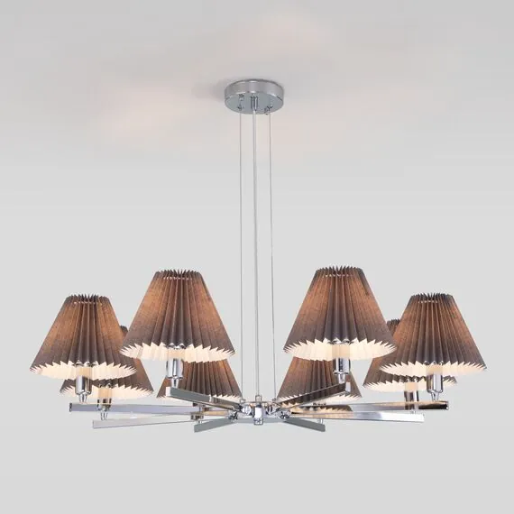Артикул: 60136/8; Бренд: Eurosvet; Серия: Peony; Стиль: Classic; товарная группа: Подвесной светильник; Тип светильника: сменная лампа; Тип светильника по помещению: гостиная;гостиница;кабинет;спальня; Срок службы, г: 6; Тип крепления: планка; Степень защиты: IP20; Питание: 230 В, 50 Гц; Площадь освещения, м2: 14; Класс электро-безопасности: I; Температурный режим: -10 ... +40; Коэффициент пульсации, %: < 5; Тип ламп: металл; Тип цоколя: E14; Материал: металл;ткань; Материал плафона: ткань; Цвет: хром;серый; Цвет каркаса: хром, Хром; Цвет плафона: серый, Серый; Умный дом: совместим с умным реле; Гарантия, мес: 12; Длина, мм: 850; Ширина, мм: 850; высота: 520; Min высота, мм: 205; max высота: 520; Диаметр потолочной чаши, мм: 100; Высота встраиваемой части, мм: 40; Вес упаковки, кг: 3.283; Длина упаковки, см: 40.4; Ширина упаковки, см: 22.6; Высота упаковки, см: 24.5; Объем упаковки, м3: 0.02236948; Штрихкод: 4690389184956