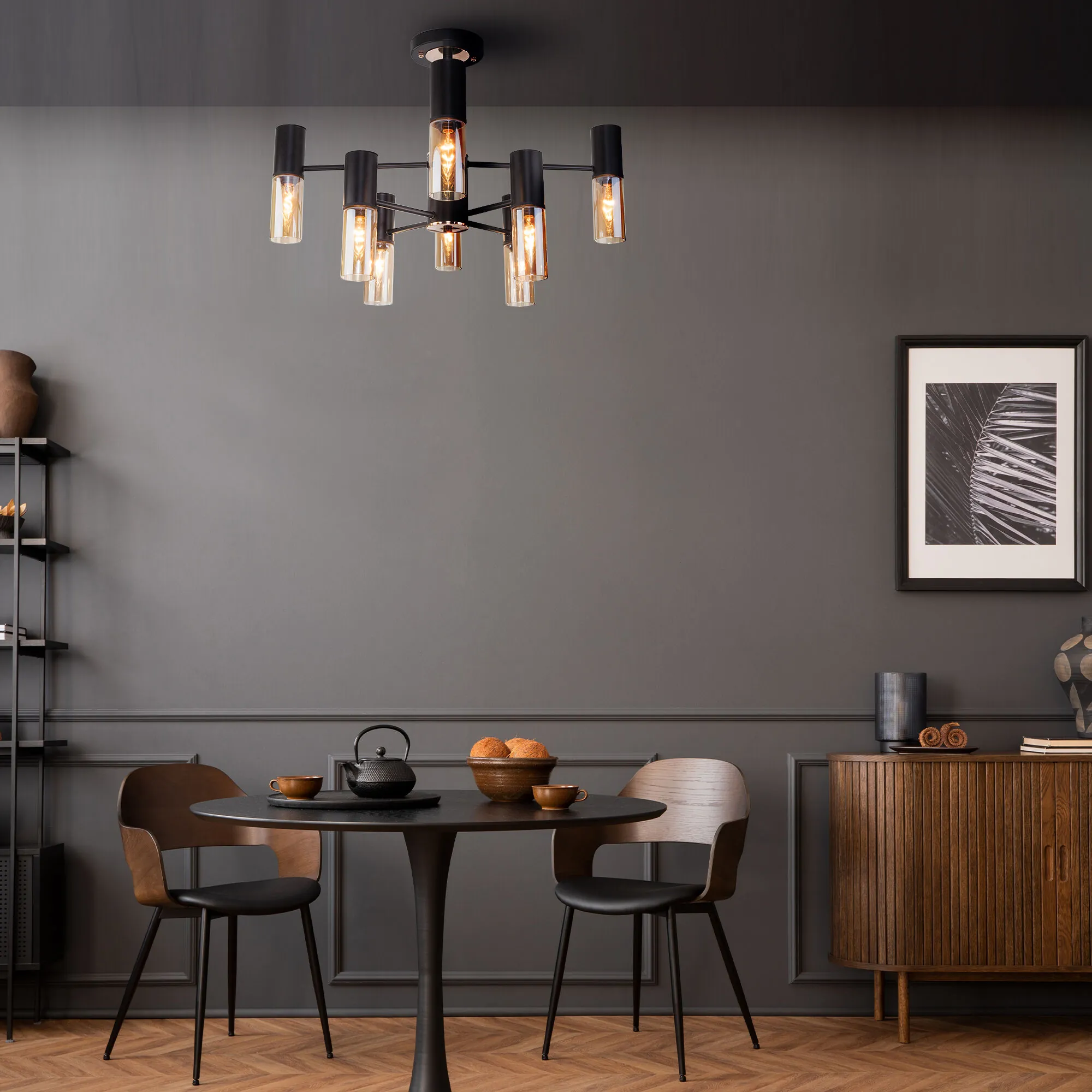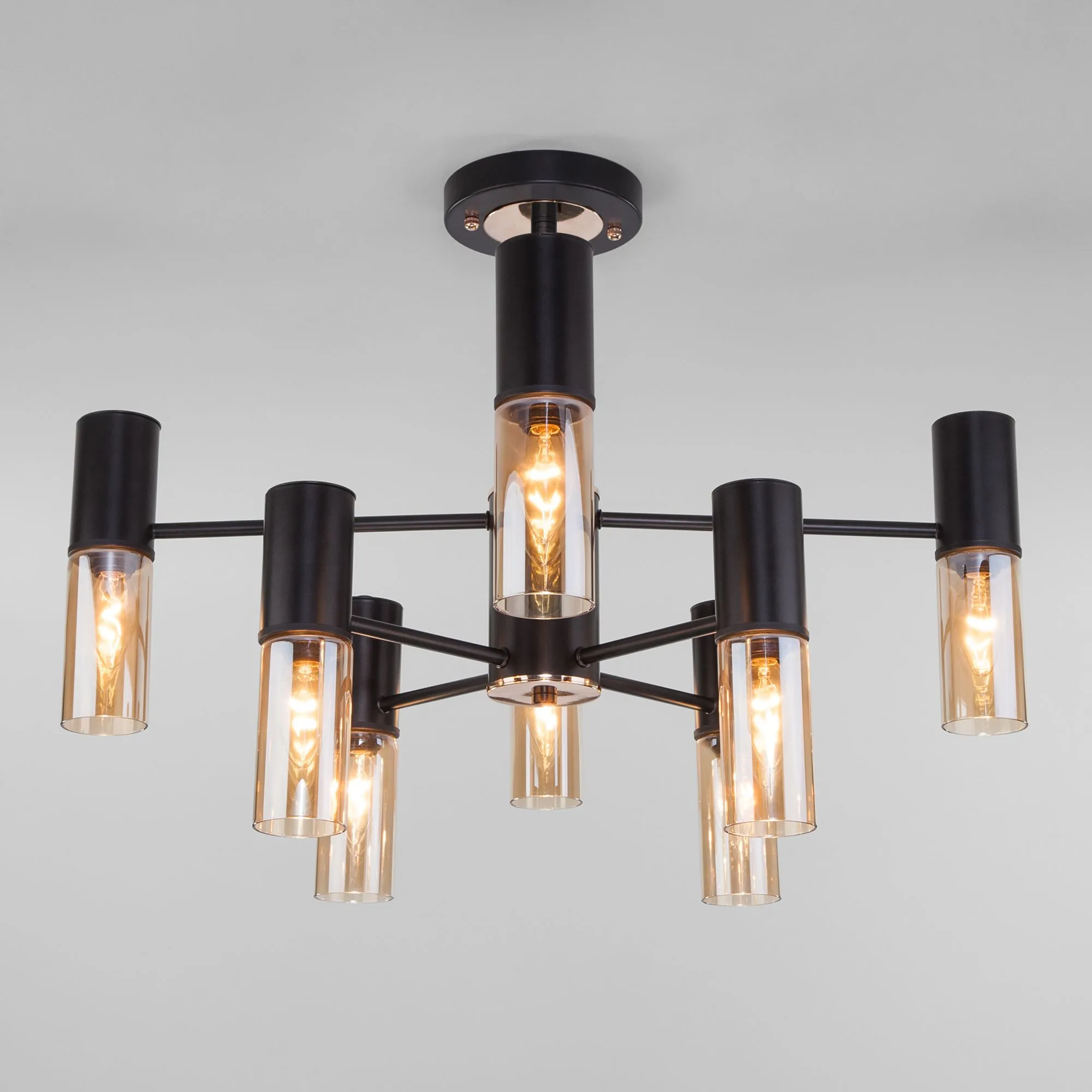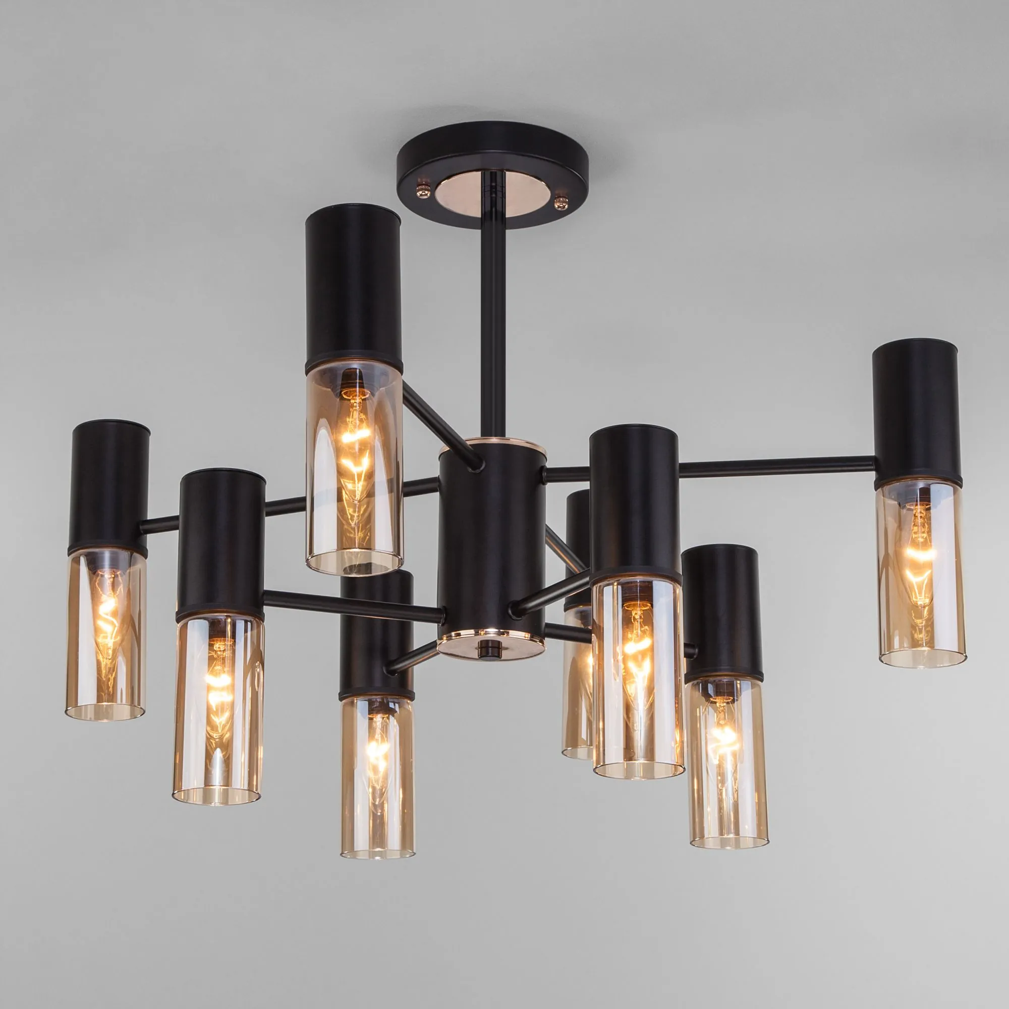 Артикул: 70125/8; Бренд: Eurosvet; Серия: Tesoro; Стиль: Loft; Контемпорари; Minimalism; товарная группа: Потолочный светильник; Тип светильника: сменная лампа; Тип светильника по помещению: гостиная;спальня;гостиница; Срок службы, г: 8; Степень защиты: IP20; Питание: 230 В, 50 Гц; Площадь освещения, м2: 16; Класс электро-безопасности: I; Температурный режим: -10 ... +40; Коэффициент пульсации, %: < 5; Тип ламп: металл; Тип цоколя: E14; Материал: металл;стекло; Материал плафона: стекло, Стекло; Цвет: черный; Цвет каркаса: черный, Черный; Цвет плафона: янтарный, Янтарный; Умный дом: совместим с умным реле;совместим с умным выключателем; Гарантия, мес: 12; Длина, мм: 720; Ширина, мм: 720; высота: 610; Диаметр потолочной чаши, мм: 120; Высота встраиваемой части, мм: 40; Вес упаковки, кг: 4.441; Длина упаковки, см: 40; Ширина упаковки, см: 38.2; Высота упаковки, см: 19.1; Объем упаковки, м3: 0.02918480; Штрихкод: 4690389168338